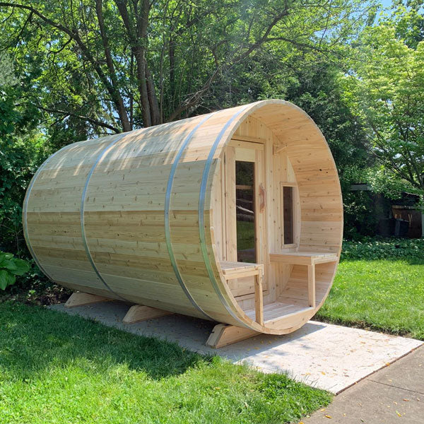 The Dundalk CT Tranquility Barrel Sauna from the Canadian Timber Collection is designed for comfort, style, and relaxation. Handcrafted from Eastern White Cedar, this sauna showcases a lighter wood tone with natural tight knots that add character and warmth. Its 45cm porch provides a welcoming entry, making it an inviting retreat for family and friends.
